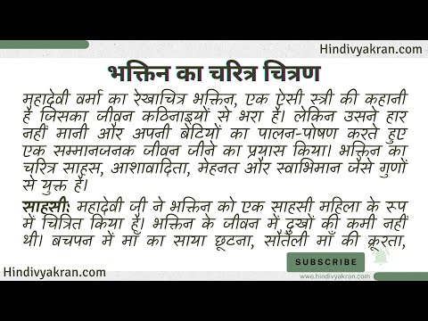 महादेवी वर्मा का रेखाचित्र "भक्तिन" एक ऐसी स्त्री की कहानी है जिसका जीवन कठिनाइयों से भरा है। लेकिन उसने हार नहीं मानी और अपनी बेटियों का पालन-पोषण करते हुए एक सम्मानजनक जीवन जीने का प्रयास किया। भक्तिन का चरित्र साहस, आशावादिता, मेहनत और स्वाभिमान जैसे गुणों से युक्त है।