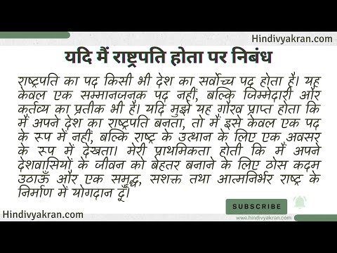 निष्कर्ष: राष्ट्रपति का पद केवल एक प्रतिष्ठा का विषय नहीं, बल्कि एक महत्वपूर्ण जिम्मेदारी होती है। यदि मैं राष्ट्रपति होता, तो मैं अपने देश को प्रगति और समृद्धि की राह पर ले जाने के लिए हर संभव प्रयास करता। मेरा सपना होता कि भारत एक ऐसा देश बने जहाँ कोई भी नागरिक भूखा न सोए, जहाँ हर बच्चा शिक्षित हो, जहाँ महिलाएँ सुरक्षित महसूस करें और जहाँ हर व्यक्ति के पास रोजगार हो। मैं अपने हर निर्णय में राष्ट्रहित को सर्वोपरि रखता और यह सुनिश्चित करता कि भारत सिर्फ़ आर्थिक और तकनीकी रूप से ही नहीं, बल्कि नैतिक और सांस्कृतिक रूप से भी एक सशक्त राष्ट्र बने।
